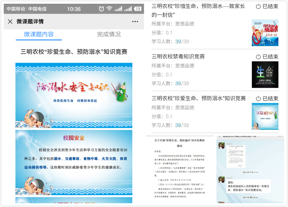 一是利用我校“全员智慧德育”平台,开展防溺水专题知识竞赛微课题,积极做好教育学生平时注重预防溺水,参于人数近两千余人;全校学生在手机平台完成了防溺水知识学习和答题测试,提升了防溺水知识。