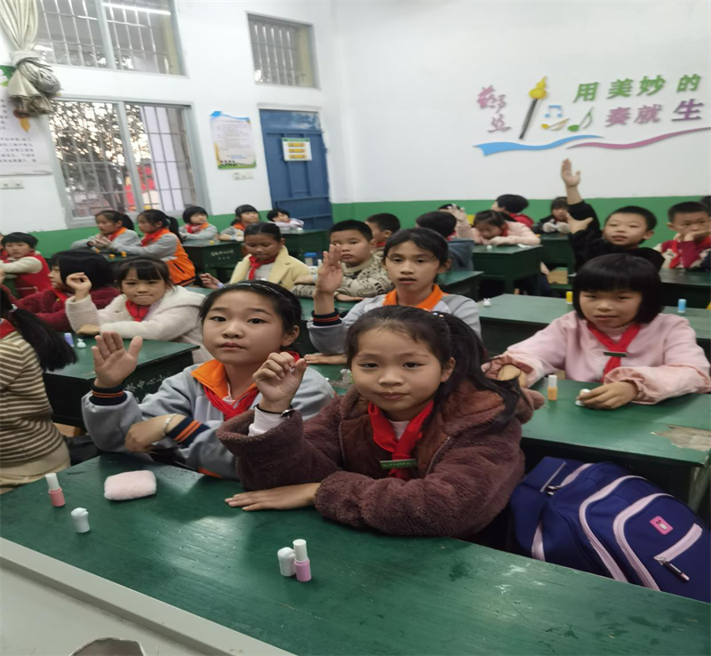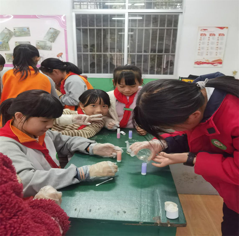 在美术教室里,同学们剪、粘、描、涂,一个个生趣盎然、色彩斑斓的“鸟巢”在他们手中诞生了。在另一个教室,同学们戴上一次性手套,以山茶油为主原料,通过配比、调制、塑形,制作了一支支安全又美丽的唇膏。