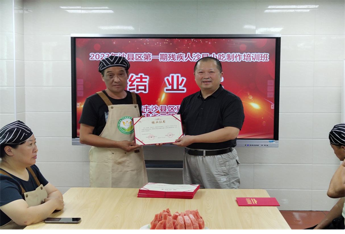 7月14日下午,由三明市沙县区残疾人联合会主办、开元(中国)承办的2023年沙县区第一期残疾人沙县小吃制作培训班结业。沙县区残联副理事长邱文忠出席结业式,并向本班20名学员颁发结业证书。他鼓励学员培训结束后积极投身实践,做到学以致用,实现就业增收。