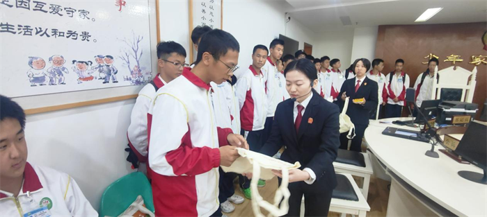 在法院二楼刑事法庭,同学们旁听了一起大学生提供银行卡帮助信息网络犯罪的刑事案件的开庭审理。从开庭调查、被告人陈述以及最后的宣判,学生们从庄严的庭审氛围中深深地感受到了法律的威严,对法律的敬畏之心油然而生。他们表示在今后的学习生活中一定将法律这把“戒尺”高高悬挂,严守法律底线,做一名“学法、懂法、守法”的新时代中职生。