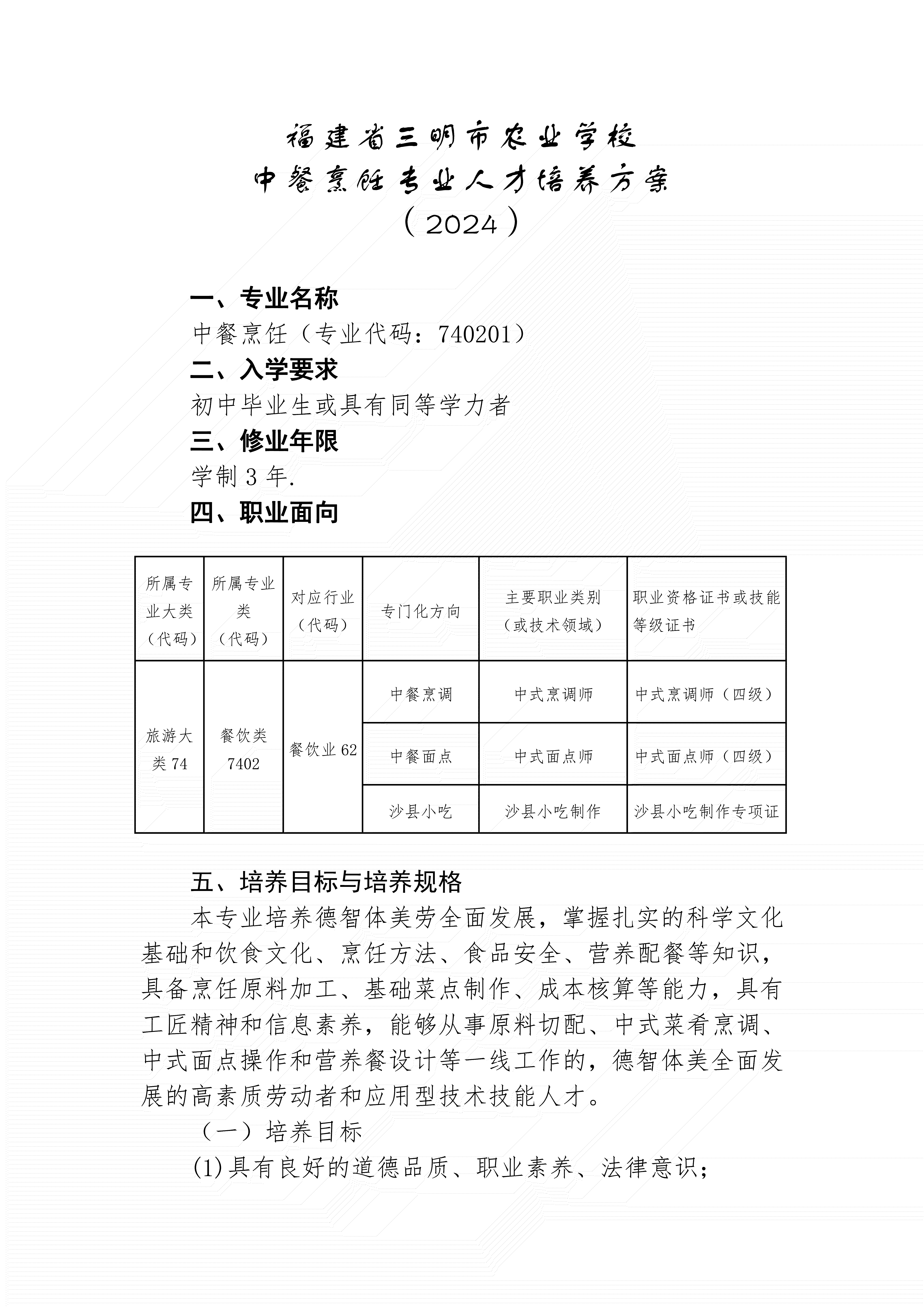 三明市农业学校中餐烹饪专业人才培养方案(2024)