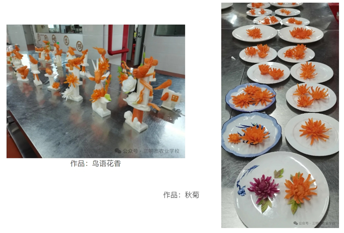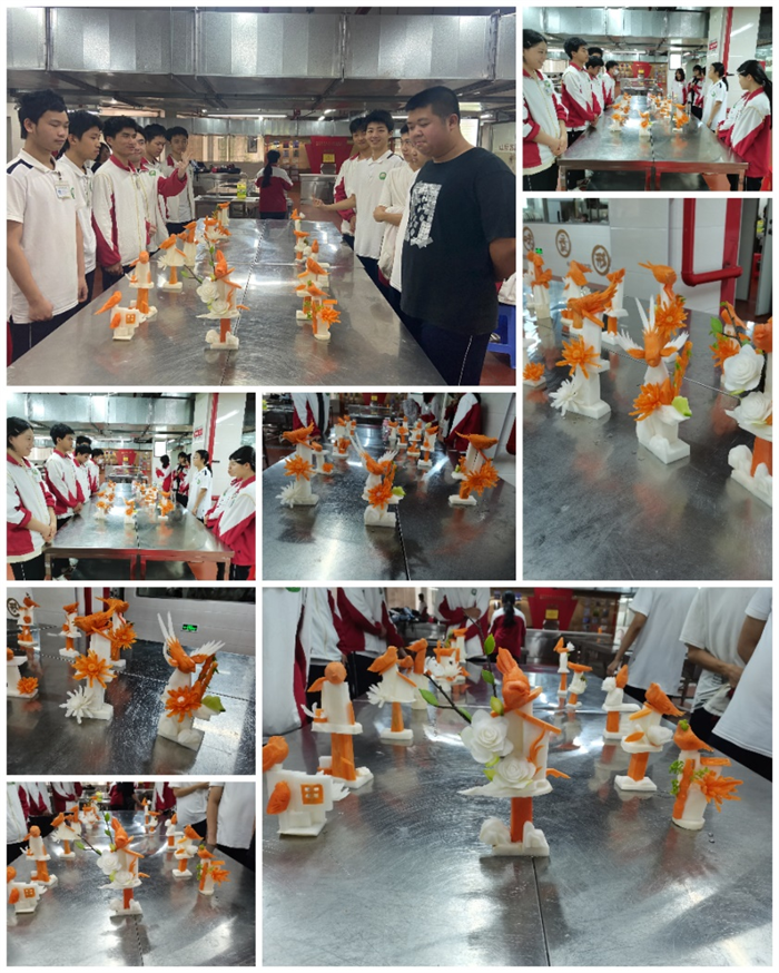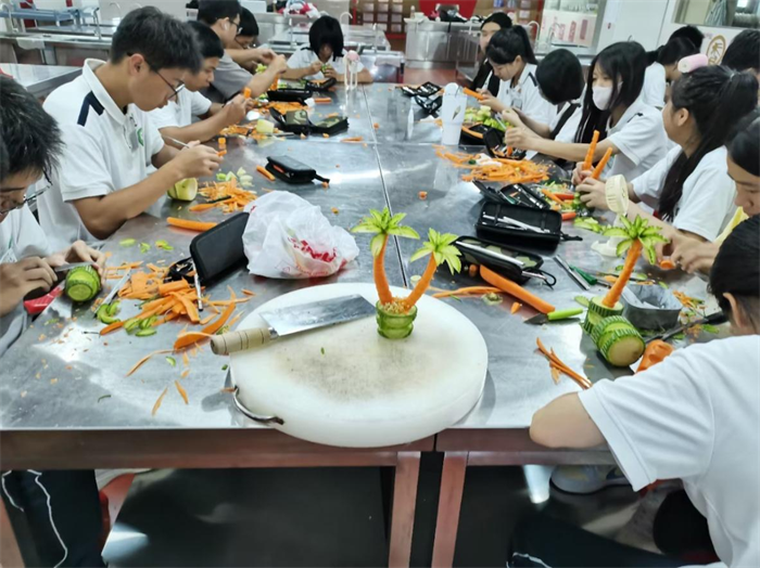活动现场,同学们热情高涨、灵动自如,将平日里刻苦钻研的烹饪技艺倾注于刀尖与锅铲之间。在他们的巧手雕琢下,原本平凡无奇的萝卜、瓜果等食材,摇身一变成为一件件栩栩如生、巧夺天工的雕刻作品,令人赞叹不已。