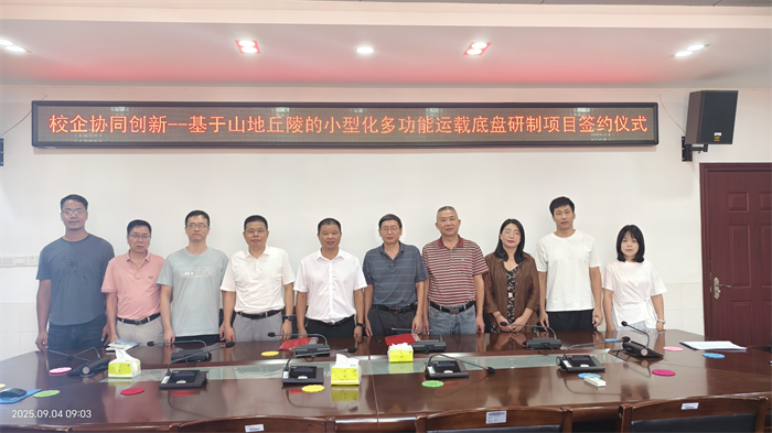 9月4日,三明市农业学校与福建智辰智能农业装备有限公司就 “基于山地丘陵的小型化多功能运载底盘研制项目” 举行签约仪式。福建智辰技术总工严积森、三明市农业学校校长陈文优、副校长谢阳军、胡安生,以及双方项目骨干团队成员共同出席仪式。